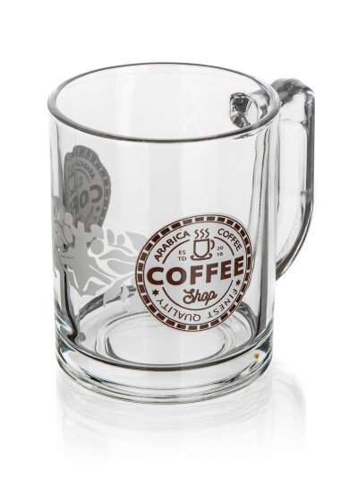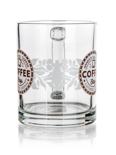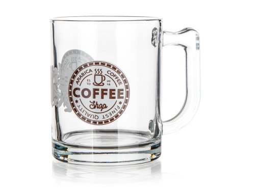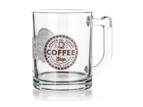 Sklenený hrnček VALUE s dekórom Káva s objemom 345 ml. Vhodné na podávanie teplých a studených nápojov.