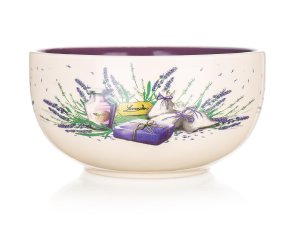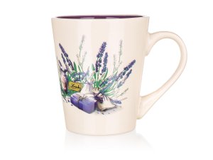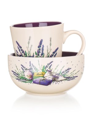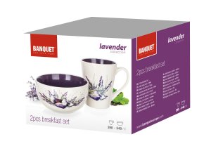 2dielna raňajková sada LAVENDER, sada obsahuje: 1x keramický hrnček s objemom 360 ml a 1x keramickú misku s objemom 540 ml, dvojfarebná glazúra s dekorom levandule.
