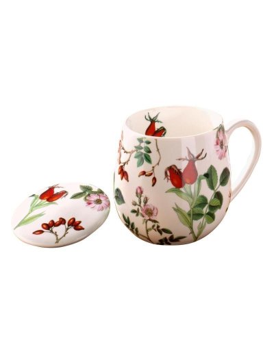 Hrnček vrátane nerezového sitka a porcelánového viečka. Materiál: Porcelán Motív: Originálne vzory šípková ruža Výška: 89 mm Objem: 420 ml