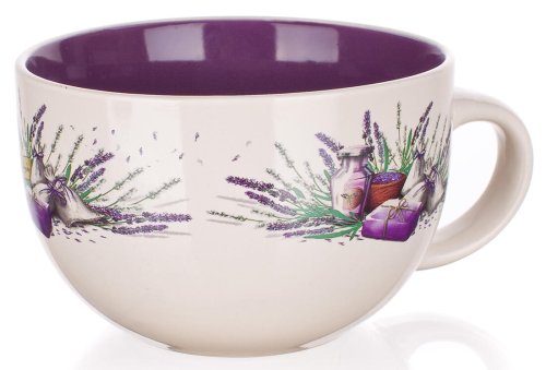 Hrnček jumbo LAVENDER, dvojfarebná glazúra s dekórom levandule. Hrnček je možné používať do mikrovlnnej rúry a umývať v umývačke riadu (pri bežnom domácom použití).