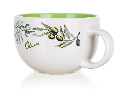 Hrnček Jumbo OLIVES je veľký keramický hrnček na podávanie horúcich i studených nápojov. Je vyrobený z keramiky s dekórom olivy.