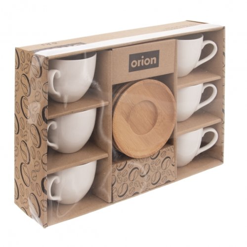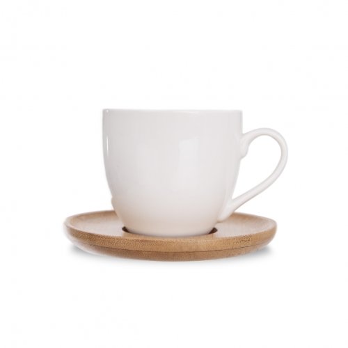 Sada hrnček s uchom a podšálkou. Materiál porcelán, bambusové drevo. Farba biela. Objem 0.14 litra, priemer šálky 6.5 cm, výška 6 cm, priemer podšálky 9.5 cm. EAN 8592381161743