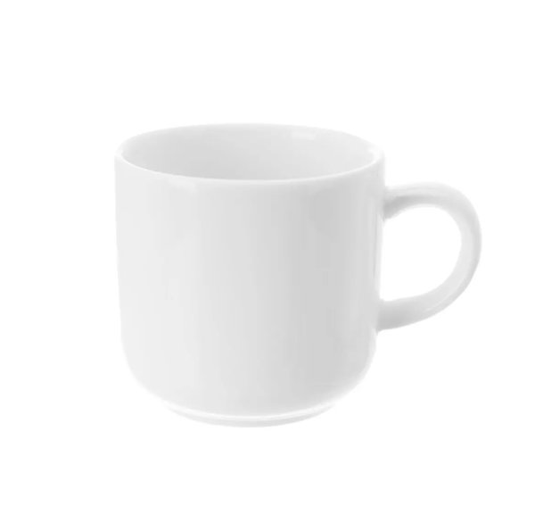 Porcelánový hrnček s uchom vhodný k tanieriku VADA. Objem 200 ml, priemer 7.5 cm, výška 7 cm. Vhodný do umývačky aj MVT. EAN 9001794777711