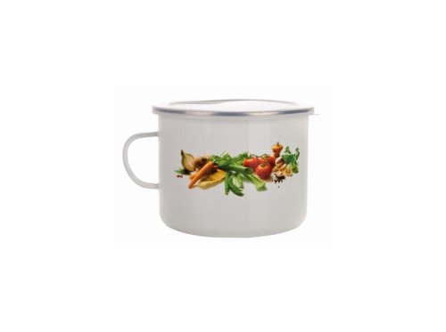 Smaltovaný hrnček s nerezovým okrajom a plastovým viečkom. Dekor zelenina. Objem 1400 ml, priemer 14 cm a výška 11.2 cm, hrúbka steny 0.4 mm. Hrnček nie je vhodný do mikrovlnnej rúry, je vhodný do umývačky riadu. EAN 8591022256886
