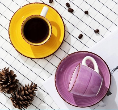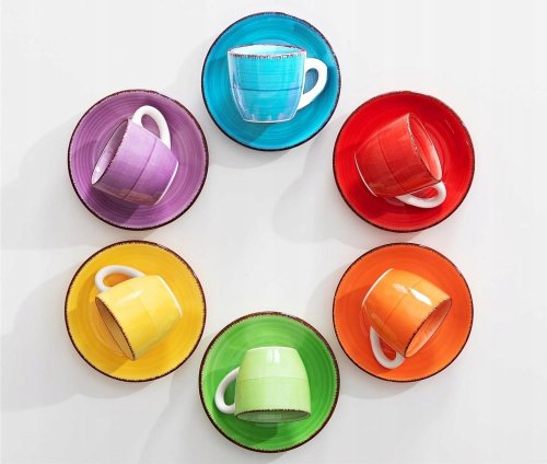 Táto sada obsahuje šesť malých šálok na espresso s objemom 90 ml a 6 padnúcich podšálok , v krásnych sýto farebných odtieňoch. Vnútro šálok je farebne glazované vo farbe šálky.