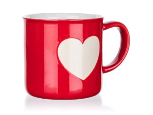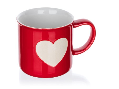Hrnček 350 ml tvar plecháčik so srdcom, červená farba, výška hrnčeka 8,6 cm, priemer 8,8 cm, materiál - keramika. Hrnček je možné používať v mikrovlnnej rúre a umývať v umývačke riadu.