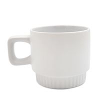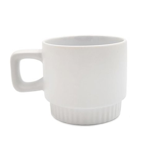 Matný keramický hrnček s vrúbkovaným dnom a hranatým uškom Vonkajšia strana je opatrená polyesterovou vrstvou Vhodný pre sublimačnú potlač Výška 82 mm, priemer 91 mm Objem 300 ml Farba biela