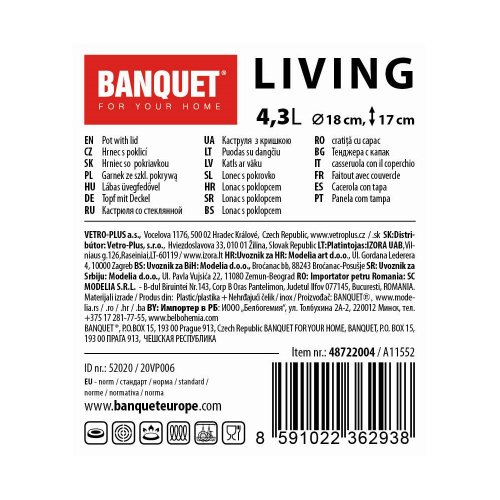 Nerezový hrniec LIVING so sklenenou pokrievkou, nerezovým knobom a držadlami. Lesklý povrch vo vnútri aj zvonku, vonkajšia strana má tri matné pruhy. Hrniec je možné použiť na všetky typy varných dosiek vrátane indukcie.