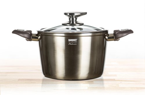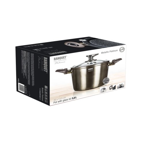 Hliníkový liaty kovaný hrniec so sklenenou pokrievkou METALLIC PLATINUM s nepriľnavým povrchom. Vonkajší karbón metalický nástrek. Hrúbka steny 3 mm. Plne indukčné dno. Soft - touch rukoväť a nerezový knob. Nepriľnavý povrch je veľmi tvrdý a odolný proti poškriabaniu. Hrniec je odolný proti nárazu.