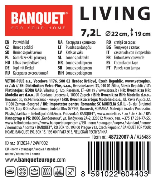 Nerezový hrniec LIVING so sklenenou pokrievkou, nerezovým knobom a držadlami. Lesklý povrch vo vnútri aj zvonku, vonkajšia strana má tri matné pruhy. Hrniec je možné použiť na všetky typy varných dosiek vrátane indukcie.