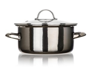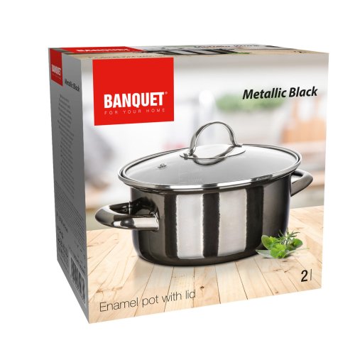Smaltovaný hrniec METALLIC Black so sklenenou pokrievkou. Hrniec je možné používať na všetky typy varných dosiek vrátane indukcie.