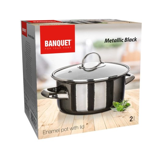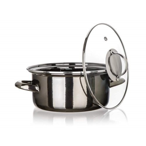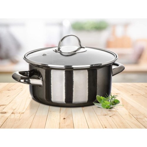 Smaltovaný hrniec so sklenenou pokrievkou. Priemer 20 cm, výška (bez pokrievky) 9 cm, hrúbka steny 0.8 mm. Hrniec je možné používať na všetky typy varných dosiek vrátane indukcie. Hrniec nie je vhodný do umývačky riadu, rúry a mikrovlnky. EAN 8591022609880