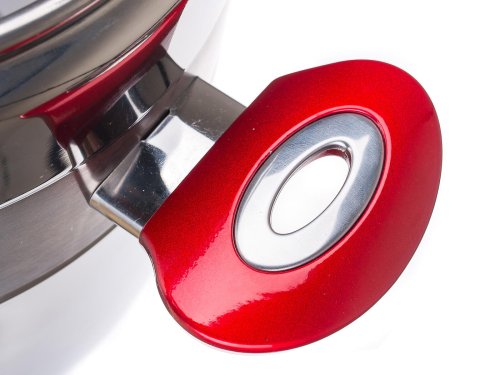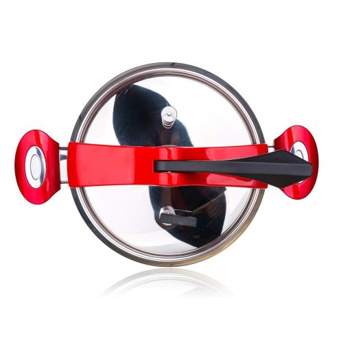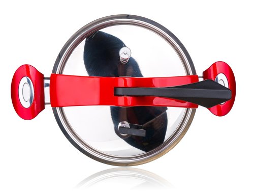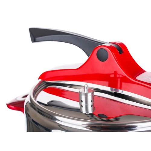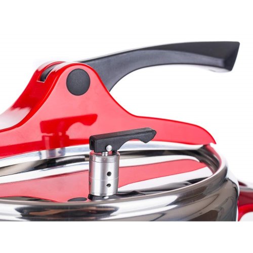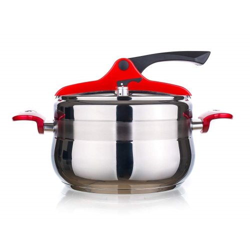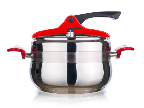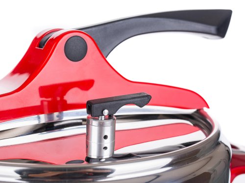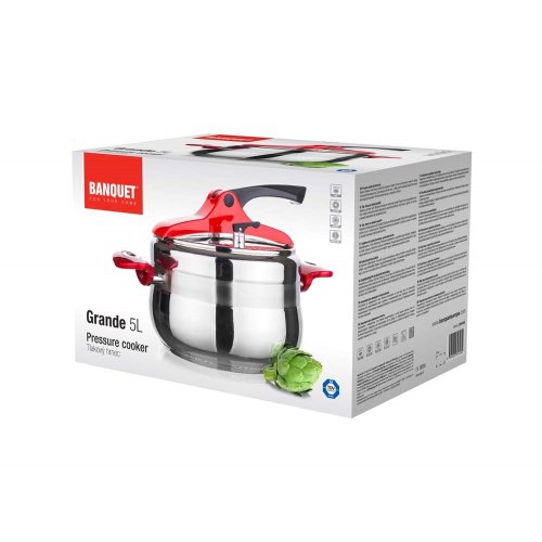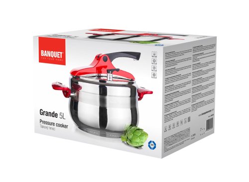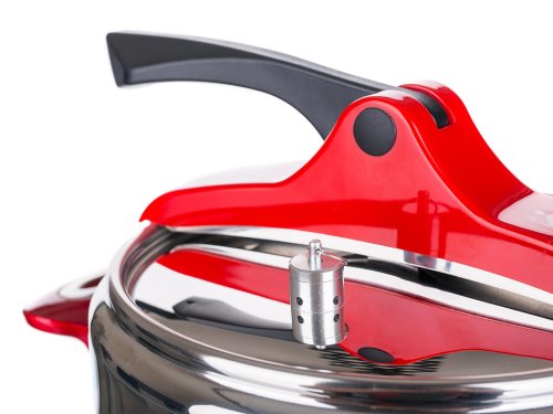 Tlakový nerezový hrniec GRANDE Red 5 l (bezpečný využiteľný objem 3,3 l), s pákovým uzáverom a trendovým baňatým tvarom. Moderné farebné prvky na uzávere a rukovätiach v červenej farbe. Tlakový hrniec je vhodný na rýchlu prípravu jedál, šetrí čas a energie. Tlakový hrniec je opatrený poistkami po bezpečné varení.