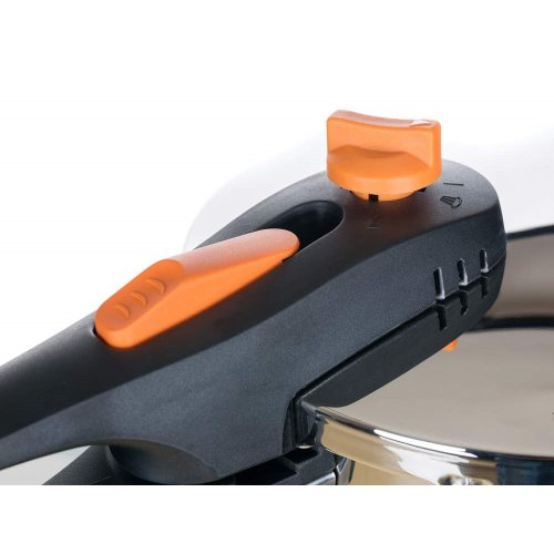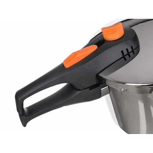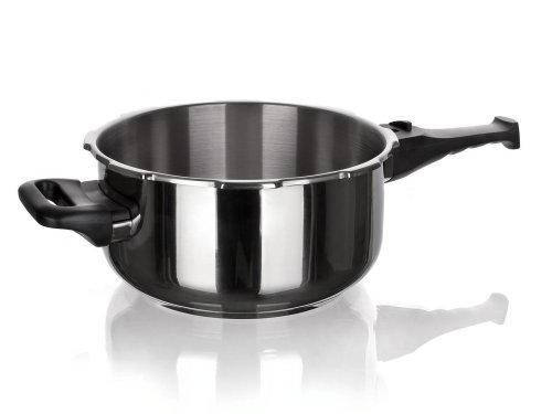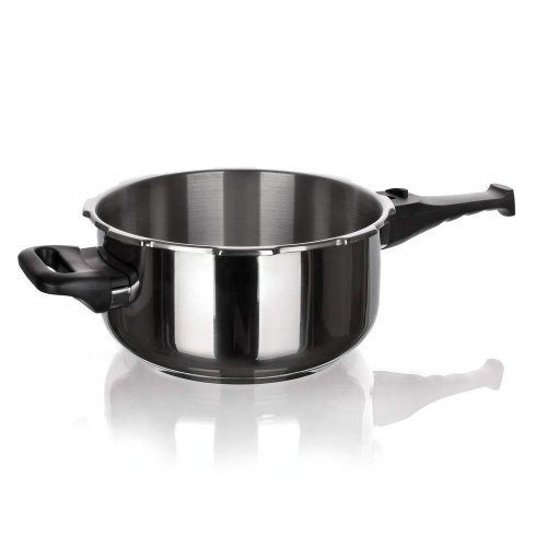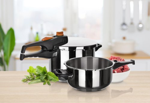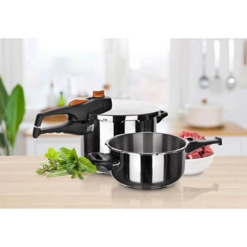 Sada nerezových tlakových hrncov ADAGIO 4/6 l, s bajonetovým uzáverom. Pokrievka obsahuje pracovný ventil, poistku proti otvoreniu natlakovaného hrnca a silikónové tesnenie. Pracovný tlak 0,6 alebo 0,9 bar. Hrnce sú vyrobené z pevného a odolného materiálu, majú silné sendvičové dno a sú vhodné na všetky typy varných dosiek vrátane indukcie.