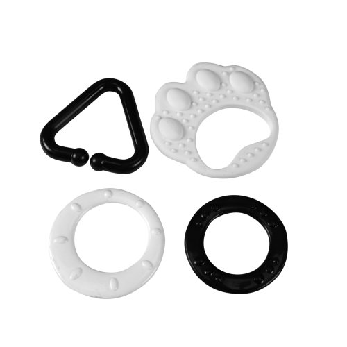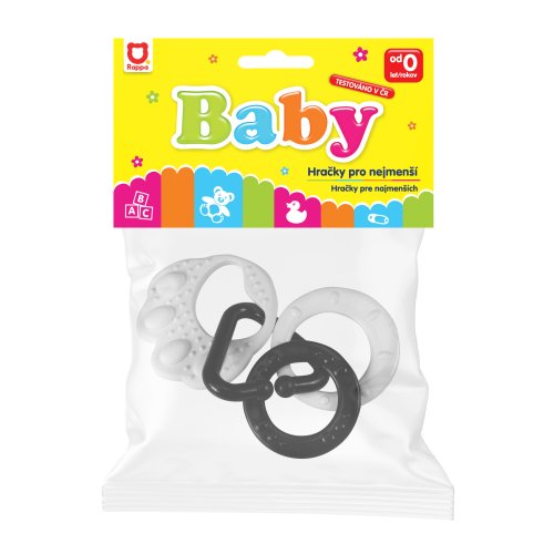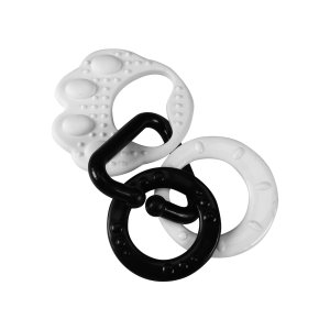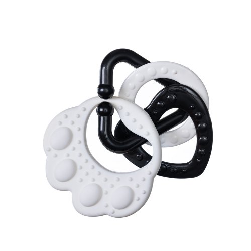 Hryzátko v čiernobielej kombinácii dokonale stimuluje zmysel zraku u dieťaťa, ktoré doteraz nerozlišuje farby. Na labke sú zavesené plastové tvary v rôznych prevedeniach, či už v tvare kolieska, srdiečka, zvončeka a pod.
