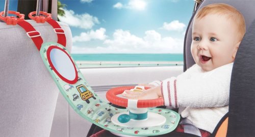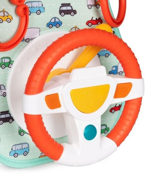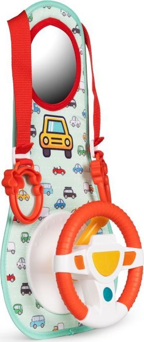 dokonale spestrí cestu vášho batoľaťa a zaistí pokojnú jazdu autom otočný volant a tlačidlá, ktoré vydávajú zvuky klaksónu a blinkrov tlačidlo pre "štartovanie" a zamykanie auta 10 veselých melódií okrúhle zrkadlo