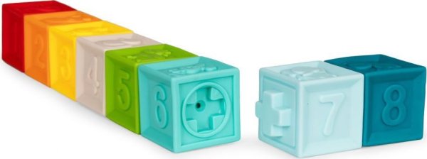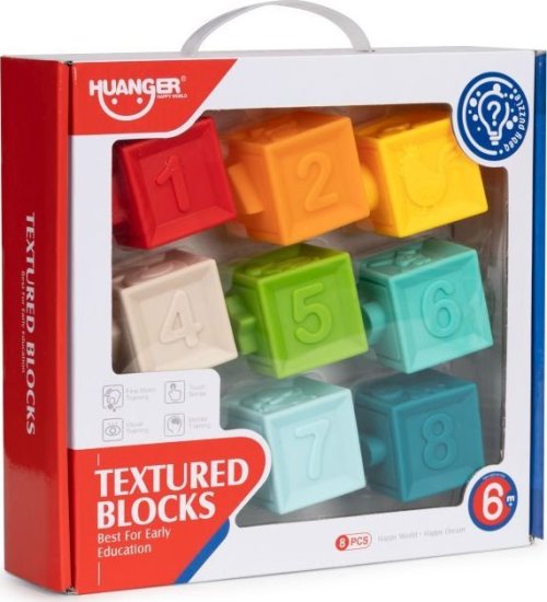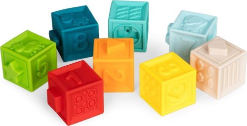 Rozvíja motoriku a zmyslové vnímanie, na jednotlivých stranách je rôzny textúrovaný povrch, tvar, zvieratko, číslo a množina zodpovedajúca danému číslu, po stlačení pískajú, je možné skladať na seba vložením vystúpeného tvaru do rovnakého otvoru kocky, vhodné na stimuláciu pohybu, rozvíjajú predstavivosť a zručnosť , prvé spoznávanie farieb, obrázkov a čísel.