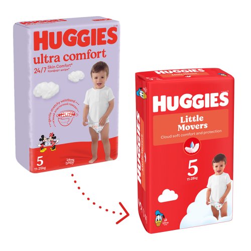 Plienky HUGGIES® Little Movers – teraz ešte jemnejšie a mäkšie – zaistia pohodlie a extra ochranu pri objavovaní nového vzrušujúceho sveta.