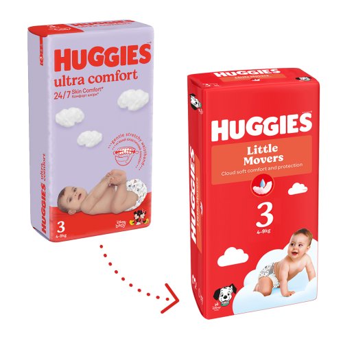 Plienky HUGGIES® Little Movers – teraz ešte jemnejšie a mäkšie – zaistia pohodlie a extra ochranu pri objavovaní nového vzrušujúceho sveta.