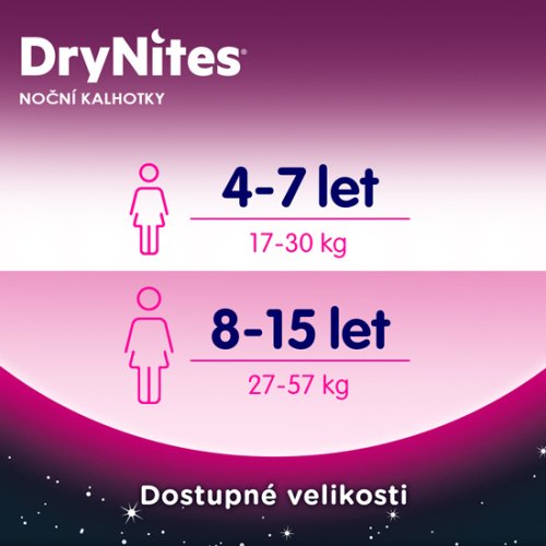 Naťahovacie plienkové nohavičky DryNites® Pyjama Pants od Huggies® sú určené pre dievčatá od 4 do 7 et. Huggies® DryNites Pyjama Pants vyzerajú ako bežné spodné prádlo, a preto je ich používanie veľmi diskrétne.