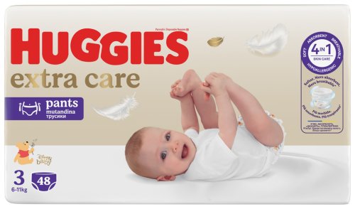 Prémiové jednorazové plienkové nohavičky Huggies Extra Care sú najjemnejšie a najmäkšie plienky pod značkou Huggies. Mäkké vankúšiky, ktoré prichádzajú do bezprostredného kontaktu s detskou pokožkou vytvárajú jemnú bariéru medzi pokožkou a tekutou stolicou. Unikátna vrstva Soft Absorb vstrebe tekutinu vo chvíľke a aj vďaka tomu zostane detský zadoček v suchu. Pred pretečením v oblasti chrbta chráni špeciálne chrbtové vrecko. Navyše materiál, z ktorého sú plienky vyrobené, umožňuje pokožke dýchať. Plienky sú 2x tenšie vďaka technológii Thin Core a absorbujú o 20% viac tekutiny ako ostatné plienky. Ľahko sa navliekajú a dávajú dole, takže prebaľovanie s nimi je hračka. Plienka obsahuje indikátor vlhkosti, ktorý zmení farbu pokiaľ sa namočí. Pre deti vážiace 6-11kg.