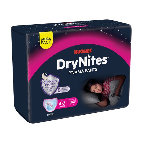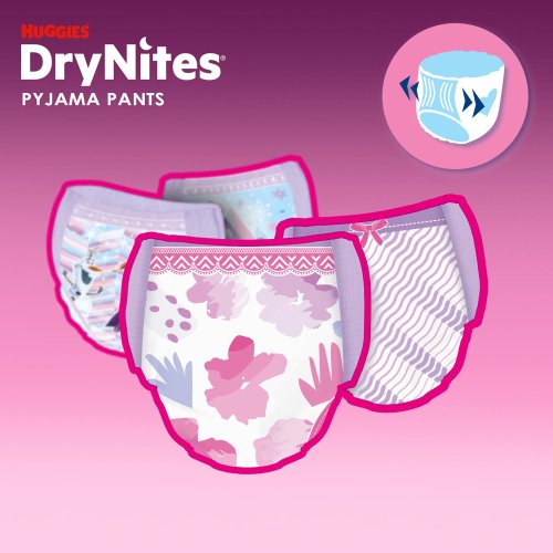 DryNites® naťahovacie nohavičky na noc pre deti vo veku od 4-7 rokov as hmotnosťou 17-30 kg poskytujú vášmu dieťaťu spoľahlivú ochranu pri nočnom pomočovaní, aby cez noc zostalo v suchu. Bolo klinicky overené, že prispievajú k lepšiemu spánku v noci. Majú 5 vrstiev, ktoré zaisťujú maximálnu ochranu pred pretečením, a vďaka svojmu jedinečnému dizajnu pripomínajú bežnú spodnú bielizeň. Zároveň sú vyrobené z priedušného materiálu, takže pokožka môže voľne dýchať. DryNites® naťahovacie nohavičky na noc umožnia vášmu dieťaťu si bez obáv užiť zábavu aj na detských táboroch, výletoch, alebo napríklad pri prespávaní u kamarátov.