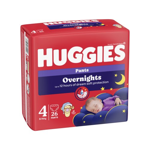 Nočné plienkové nohavičky HUGGIES® Overnights spoľahlivo chránia po celý čas spánku, až 12 hodín. Mäkké a jemné na pohodlný spánok. Technológia Quick Dry absorbuje tekutinu v priebehu niekoľkých sekúnd.