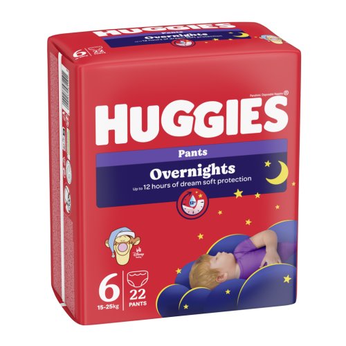 Nočné plienkové nohavičky HUGGIES® Overnights spoľahlivo chránia po celú dobu spánku, až 12 hodín. Mäkké a jemné pre pohodlný spánok.