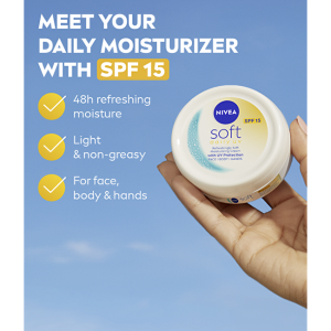 Ikonický hydratačný krém Nivea Soft prichádza s inovovaným zložením a ochranou SPF 15, ktorá chráni pokožku pred škodlivými UVA/UVB lúčmi spôsobujúcimi predčasné starnutie a poškodenie kože. Tento univerzálny krém poskytuje intenzívnu hydratáciu, výživu a ochranu až na 48 hodín a je ideálny na každodennú starostlivosť o tvár, telo i ruky.