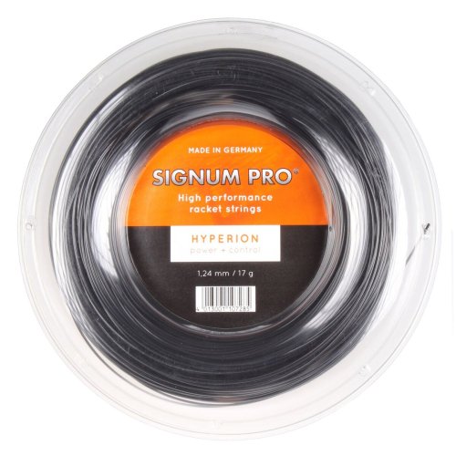 Tenisový výplet Signum Pro Hyperion je veľmi kvalitný a dokonca cenou časopisu Tennis Magazine ocenený. Tento model výpletu je vhodný pre hráčov, ktorí vyžadujú maximálnu pružnosť. materiál: kopolymér Polyester Struny s priemermi 1,18mm, 1,24mm a 1,30mm sa vyrábajú v diamantovo čiernej farbe, ponúkame 200m a 100m rolky, vyskúšať môžete aj 12m balenie.