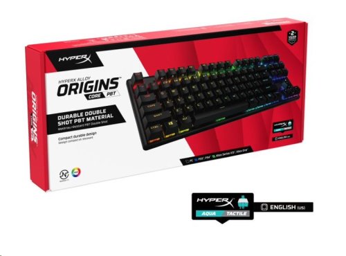 HyperX Alloy Origins Core PBT HX Aqua - mechanická herná klávesnica HyperX Alloy Origins Core PBT je ultrakompaktná, robustná klávesnica bez numeriky as vlastnými mechanickými spínačmi HyperX, ktorá hráčom poskytuje najlepšiu kombináciu štýlu, výkonu a spoľahlivosti. Tento variant zvyšuje odolnosť pridaním predinštalovaných kláves z PBT s bočnou potlačou. Mechanické klávesové spínače HyperX disponujú odkrytými LED diódami, ktoré vyžarujú viac svetla a zaisťujú oslnivejšie a pôsobivejšie podsvietenie. Navyše sa pýši rýchlou odozvou a presnosťou vďaka dokonalej kombinácii aktivačnej sily a zdvihu. Alloy Origins Core má celohliníkové telo, zostáva tak pevná a stabilná. Navyše disponuje nožičkami, ktoré ponúkajú tri rôzne úrovne náklonu. Kompaktný dizajn TKL uvoľňuje pri stolných počítačoch drahocenné miesto na pohyb myšou a zahŕňa odpojiteľný kábel USB-C pre jednoduché prenášanie. Výkonný a intuitívny softvér HyperX NGENUITY ti umožní meniť podsvietenie, vytvárať makrá a nastavovať herný režim.