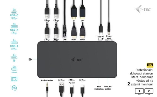 Univerzálna dokovacia stanica i-tec Thunderbolt 3 Professional Dual 4K , ktorá je vďaka bohatej ponuke konektorov kompatibilná s notebookmi, tabletmi externými monitormi a pod. Podporuje vysoký výkon až 1000 W Power Delivery , vďaka čomu je vhodná pre profesionálne použitie.