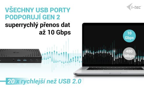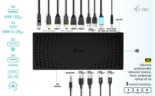 Dokovacia stanica je vybavená piatimi grafickými výstupmi, vďaka ktorým podporuje pripojenie až troch displejov s rozlíšením 4K pri 60 Hz . K počítaču či notebooku sa pripája pomocou USB 3.0 alebo USB-C portu s podporou Thunderbolt 3 a je tak schopná na podporovaných zariadeniach prenášať aj napájanie až 100 W. Dokovacia stanica ďalej ponúka kombinovaný audio konektor, RJ-45 port, štyri USB 3.1 porty , dva porty USB-C a zámok Kensington. V neposlednom rade určite poteší aj možnosť VESA uchytenia .