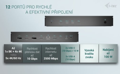 Dokovacia stanica umožňuje pripojiť notebook, tablet alebo smartfón k ďalším monitorom a hardvéru. K počítaču či notebooku sa pripája pomocou USB-C portu s podporou Thunderbolt 3/4 a USB4 . Na podporovaných zariadeniach je tak schopná prenášať aj napájanie až 100 W. K dokovacej stanici je možné pripojiť päť 4K monitorov pri 60 Hz . Vysokorýchlostný prístup k internetu je možné realizovať cez prítomný RJ-45 port. Pre pripojenie periférií sú prítomné dva USB-C a tri USB 3.1 porty . Dokovaciu stanicu je možné nainštalovať aj dozadu za monitor s podporou VESA uchytenie vďaka VESA držiaku (nie je súčasťou), čím získate ako maximálnu pracovnú efektivitu vďaka rozšíriteľnosti portov, tak aj krásne uprataný stôl bez káblov. Pre pripojenie slúchadiel či mikrofónu potom slúži kombinovaný 3,5 mm konektor . Poteší aj slot pre bezpečnostný zámok a vypínač dokovacej stanice pre maximálnu úsporu elektrickej energie.