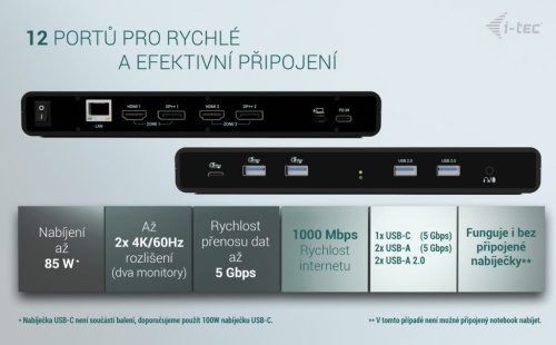 Univerzálna dokovacia stanica I-TEC Universal Dual 4K Display vám umožní pripojenie rozmanitých PC periférií, a to vrátane až dvoch monitorov so 4K rozlíšením cez rozhranie HDMI a DisplayPort . Zariadenie je kompatibilné ako s modernými notebookmi, tak aj tabletmi , vďaka čomu sa jedná o univerzálnu dokovaciu stanicu pre najrôznejšie zameranie a využitie.
