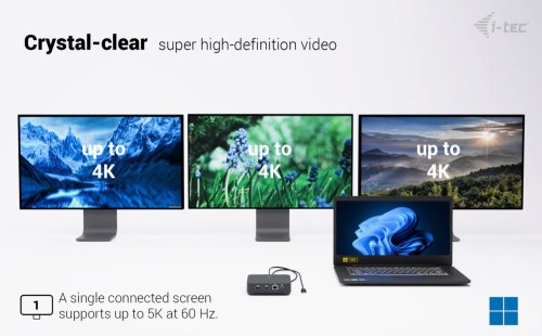 I-TEC USB-C DP Dual HDMI Dock podporuje pripojenie až 3 externých monitorov s rozlíšením 4K alebo jedného monitora s dych vyrážajúcim rozlíšením 5K/60 Hz . Výrazne tak rozširuje pracovnú plochu a je vhodný na grafickú prácu, analytiku a všetky činnosti náročné na detailné zobrazenie.