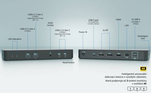 Dokovacia stanica podporuje pripojenie až troch externých monitorov v rozlíšení až 4K a je kompatibilná s notebookmi vybavenými portami USB-C, USB4 alebo Thunderbolt™ 3/4/5. Ponúka celkom 6 USB portov, vrátane rýchlych USB-C a USB s podporou Gen 2 (10 Gb/s), gigabitový Ethernet a Power Delivery až 100 W na nabíjanie vášho notebooku alebo tabletu.