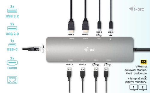 Malá kovová dokovacia stanica podporujúca pripojenie dvoch HDMI monitorov súčasne s rozlíšením až 4K pri 60 Hz . K počítaču či notebooku sa pripája pomocou USB-C portu s podporou Thunderbolt 3/4 a je tak schopná na podporovaných zariadeniach prenášať aj napájanie až 100 W. Pre pripojenie periférií sú prítomné dva USB 3.0 porty, dva USB 2.0 porty a USB-C 3.2 Gen1 port. Gigabitový RJ-45 ethernetový port poskytuje spoľahlivé vysokorýchlostné pripojenie k internetu.