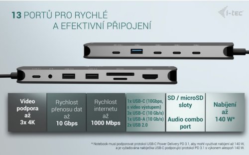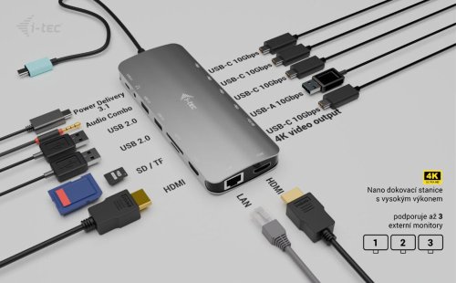 I-TEC USB-C Metal Nano 3× Display Dock predstavuje kompaktnú dokovaciu stanicu v kovovom prevedení , ktorá razantným spôsobom rozšíri možnosti konektivity moderného kompatibilného zariadenia. Je ľahko prenosná a ideálna na využitie v kancelárii aj na cestách. Disponuje celým radom portov, ktoré oceníte pri pripojení monitora alebo periférnych zariadení. K tomu pridáva napríklad aj port RJ-45 pre priame a stabilné pripojenie k sieti alebo slot pre SD kartu či micro SD kartu . Dokovacia stanica I-TEC USB-C Metal Nano obsahuje tiež päť USB-C portov , pričom tri umožňujú prenos dát, ďalšie plnia funkciou Power Delivery pre napájanie a poslednú s funkciou pre video.