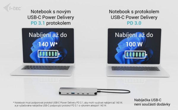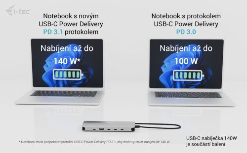Pokiaľ váš notebook alebo tablet podporuje nový a moderný nabíjací protokol USB-C Power Delivery PD 3.1, dokovacia stanica ponúkne nabíjací výkon až 140 W (ak máte protokol PD 3.0, nabíjací výkon bude až 100 W).