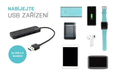 Štýlový a kompaktný USB hub umožňuje pripojiť až štyri USB zariadenia do jedného USB 3.0 konektora počítača. Hlavnou výhodou je možnosť zapínať a vypínať jednotlivé USB porty a tým dosiahnuť maximálne rýchlosti pri aktívnych portoch. USB hub je vybavený aj micro USB portom pre pripojenie voliteľného napájacieho adaptéra s výkonom až 10 W (nie je súčasťou balenia). Podporuje širokú škálu operačných systémov od Windows a Mac OS až po Linux.