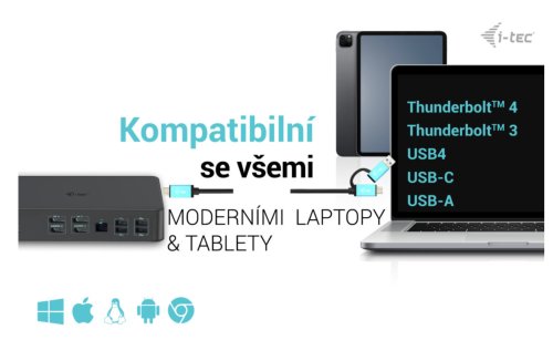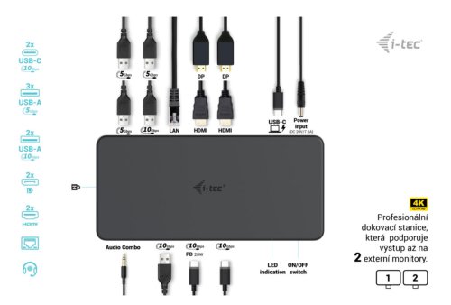 • 1-port USB-C 3.2 Gen 2 (iba dáta), BC 1.2 • 1-port USB-C 3.2 Gen 2, PD 20 W • 1-port USB 3.2 Gen 2, BC 1.2 • 1-port USB 3.2 Gen 2 • 3-krát port USB 3. Gen 1 • 1x port Ethernet GLAN RJ-45 (DisplayLink DL-6950) • 1x 3,5 mm kombinovaný audio port, podporujúci vysoko kvalitnú vzorkovaciu frekvenciu 32bit/192 kHz a záznam • 1x vstup napájania (DC 20V/7,5A) • Klonovanie adries MAC: Áno (pomocou softvéru i-tec Docker Pro) • WOL: S1, S2, S3 • Vypínač na zapnutie a vypnutie dokovacej stanice • Indikátor LED • Podpora zámku Kensington • Podpora montáže VESA • Kábel USB-C s adaptérom USB- C na USB-A (100 cm) • Operačný systém: Windows 10/11, macOS, Android 5 alebo novší, Chrome OS R51 alebo novší, Linux Ubuntu • Jednoduchá inštalácia ovládačov (Windows, MacOS, Ubuntu, Android (externý odkaz)) • Rozmery produktu: 190 x 88 x 37 mm • Hmotnosť výrobku: 539 g • Rozmery balenia: 253 x 200 x 54 mm ** Rozlíšenie 5K je podporované iba systémom Windows
