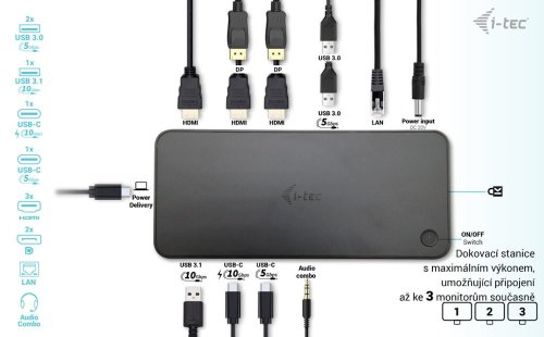 Dokovacia stanica ponúkajúca veľké množstvo praktických portov. Pripojenie k počítaču je realizované cez USB-C kábel s podporou Thunderbolt 3 . Stanica taktiež ponúka USB-C Power Delivery až 100 W , ktorý je určený pre napájanie pripojeného notebooku či tabletu pomocou vášho originálneho sieťového adaptéra. K dokovacej stanici je možné pripojiť až tri monitory cez rozhranie HDMI či DisplayPort s maximálnym rozlíšením až 4K . Pripojenie k trom monitorom však bude možné iba v prípade notebooku s portom Thunderbolt 3/4, prípadne USB-C portom podporujúcim prenos videa. Samozrejmosťou sú tri USB porty , spoľahlivé a rýchle pripojenie k internetu vďaka integrovanému LAN portu a nechýba ani podpora audio vstupu/výstupu. Dokovaciu stanicu je možné nainštalovať aj dozadu za monitor s podporou VESA uchytenie vďaka VESA držiaku (nie je súčasťou), čím získate ako maximálnu pracovnú efektivitu vďaka rozšíriteľnosti portov, tak aj krásne uprataný stôl bez káblov.