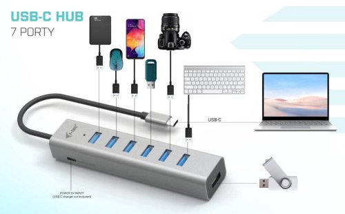 • Nabíjací HUB USB-C až pre 7 zariadení • Kompatibilný so všetkými notebookmi alebo tabletmi s portami USB-C, USB4 alebo Thunderbolt • Kovové telo ponúka maximálnu odolnosť a ochranu • Vďaka malým rozmerom sa HUB ľahko prenáša aj vo vrecku • 7x USB 3.0 portov ponúka možnosť pripojenia rôznych periférií aj rýchleho HDD/SSD alebo flash disku pre rýchly prenos dát • Rýchlosť nabíjanie až 7,5 W na port • Prídavný port USB-C na nabíjanie portov HUB s výkonom až 15 W (adaptér nie je súčasťou dodávky) • HUB podporuje všetky bežné súčasné operačné systémy (Windows, macOS, Linux, Android, Chrome OS, iPadOS )