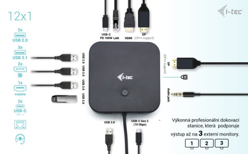 • Pripojte až tri externé monitory 4K/30Hz • Obnovovacia frekvencia až 360 Hz (pri pripojení k jednému monitoru v rozlíšení 1080p) • Power delivery: až 100 W • 1x HDMI, 2x DisplayPort++ • 3x USB 3.1, 1x USB-C 3.2 Gen 10 Gbps) a 2x USB 2.0 vám umožní jednoduché pripojenie vašich USB zariadení a periférií. Gigabitový Ethernet RJ-45 poskytuje spoľahlivé, robustné a vysokorýchlostné internetové pripojenie s podporou 10/100/1000 Mbps rýchlosťou • Kombinovaný jack pre audio a mikrofón na prednom paneli • Zámok Kensington zaistí ochranu proti odcudzeniu, najmä v prostredí zdieľaných kancelárií či verejne prístupných miest • Vypínač dokovacej stanice umožní maximálnu úsporu elektrickej energie • Dokovacia stanica podporuje držiak VESA pre inteligentnú vertikálnu inštaláciu za monitor s VESA podporou • Podporuje Windows 10, macOS, Android, iPadOS, ChromeOS a Linux