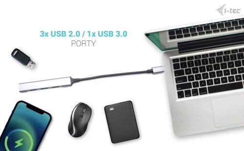 S týmto hubom získate ďalší jeden USB 3.0 a tri USB 2.0 porty . Pripojte si externú klávesnicu a myš, prenášajte dáta alebo filmy z USB flash disku rýchlosťou až 5 Gbps alebo nabíjajte svoje mobilné zariadenia. Hub nevyžaduje inštaláciu ovládačov, iba ho pomocou USB-C kábla pripojíte a môžete ho ihneď začať využívať.