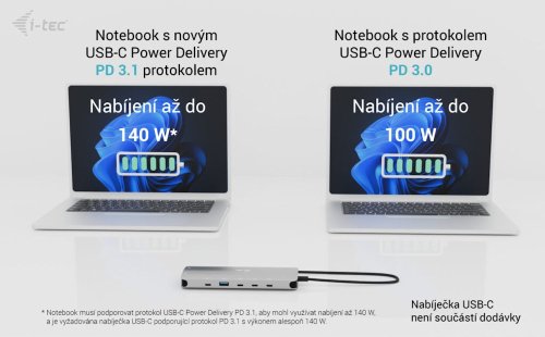 Pokiaľ váš notebook alebo tablet podporuje nový a moderný nabíjací protokol USB-C Power Delivery PD 3.1, dokovacia stanica ponúkne nabíjací výkon až 140 W (ak máte protokol PD 3.0, nabíjací výkon bude až 100 W).