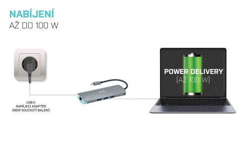 Stanica taktiež ponúka USB-C Power Delivery až 100 W, ktorý je určený pre napájanie pripojeného notebooku či tabletu pomocou vášho originálneho sieťového adaptéra. Dokovacia stanica tiež podporuje nabíjanie pripojených USB mobilných zariadení, ako sú smartfóny, čítačky e-kníh, multimediálne prehrávače, navigácia a tablety.