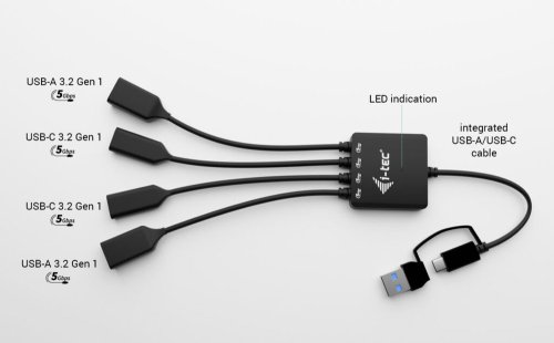 Špecifikácia: • 1× integrovaný USB-A/USB-C kábel pre pripojenie k zariadeniu (10 cm) • 2× USB-C 3.2 Gen 1 (5 Gbps) na ohybnom USB kábli • 2× USB-A 3.2 Gen 1 (5 Gbps) na ohybnom USB kábli • LED indikácia