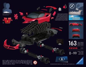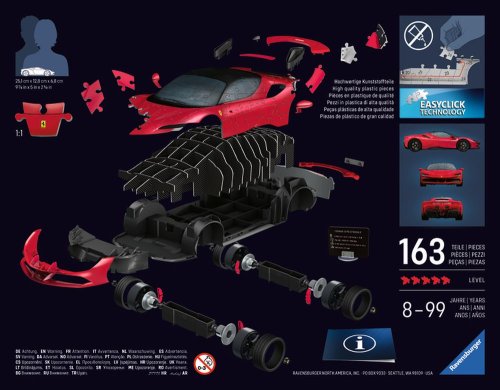 Zažite jedinečnú kombináciu skladania a stavania a vytvorte si pôsobivý model jedného z najikonickejších vozidiel Ferrari SF 90 Stradale v neprehliadnuteľnej červenej farbe zo 108 dielikov. Kvalitné, plastové puzzle s technológiou Easyclick. Bez nutnosti lepenia! S funkčnými otáčacími kolesami. Puzzle obsahuje pevnú vnútornú konštrukciu na zaistenie maximálnej stability zloženého modelu.
